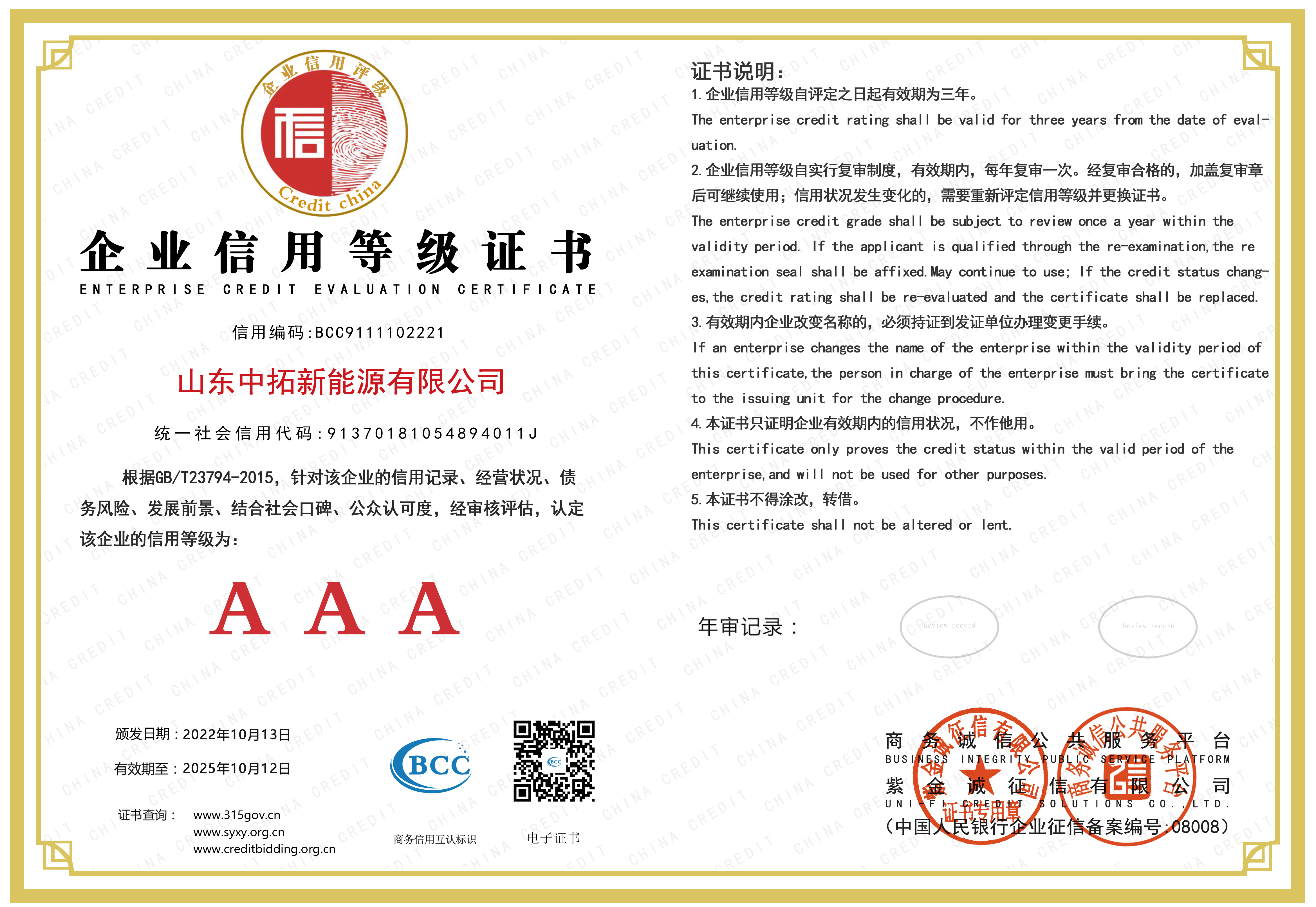 • AAA級企業信用等級